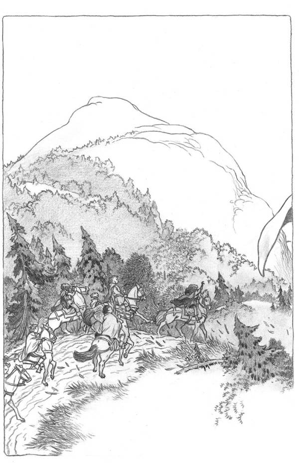 Они ехали верхом весь день, и так быстро, как могли выдержать лошади. Уже совсем в сумерках они добрались до маленького городка, спрятавшегося среди холмов, где лошадей можно было накормить и разместить на отдых. Сами наездники едва живые повалились на чрезвычайно неудобные кровати. Те из них, кто совершенно не привык к езде верхом, обнаружили, что едва могут передвигать ноги. Выяснилось, что здешние жители о драконах и слыхом не слыхивали. Больше всего их поразило появление целого отряда богатых незнакомцев на лошадях, которые потребовали всего лишь овес да постели и заплатили за это серебряными и золотыми монетами.