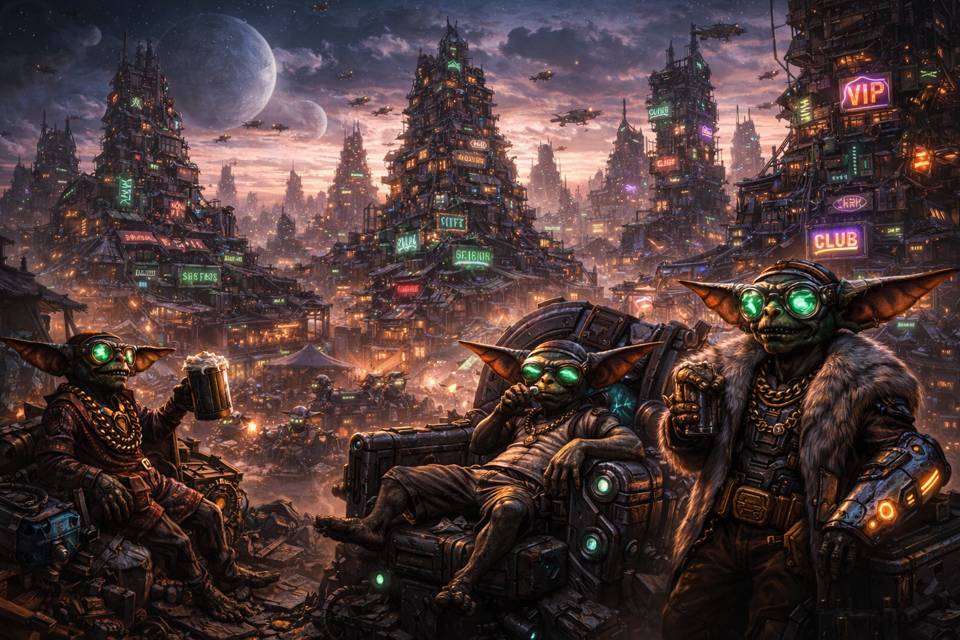 Шаттл под управлением ИИ без проблем вошёл в атмосферу и пролетел над столицей гремлинов. Она была под стать зелёным коротышкам, такой же хаотичной и крикливой. Весь город состоял из случайно разбросанных небоскрёбов, собранных из частей других домов. Куда ни брось взгляд — всюду яркие неоновые вывески. Мы прилетели ночью, но светло было словно в разгар дня, без всякого дополнительного освещения.