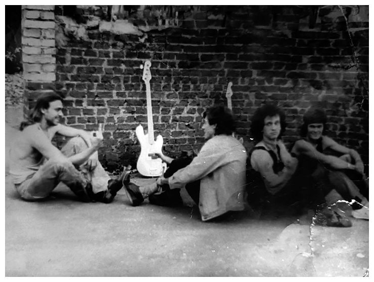 Группа «Школа». Слева направо: Виталий «Питон» Сукочев, Василий «Самоделкин» Черных, Игорь Кущ, четвёртый музыкант не идентифицирован. Репетиционная база во дворе Краеведческого музея. Музыканты сидят на фоне глухого торца флигеля репетиционной базы филармонии. Начало 1990-х