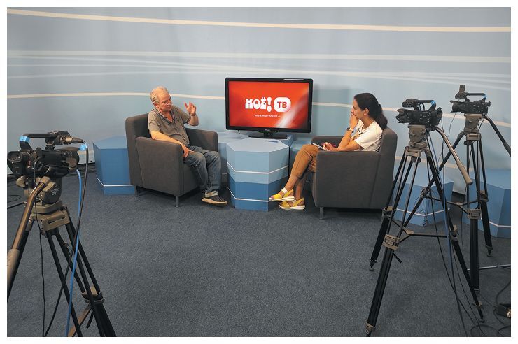 Игорь Кущ даёт интервью воронежскому порталу «Моё». Анна Ясырева и Игорь Кущ, 2022 год