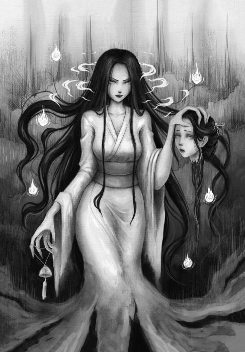 Хотя двери были крепко заперты и ширмы стояли на месте, в спальню легко, словно тень, скользнула женщина… женщина в погребальном одеянии, с колокольчиком в руке.