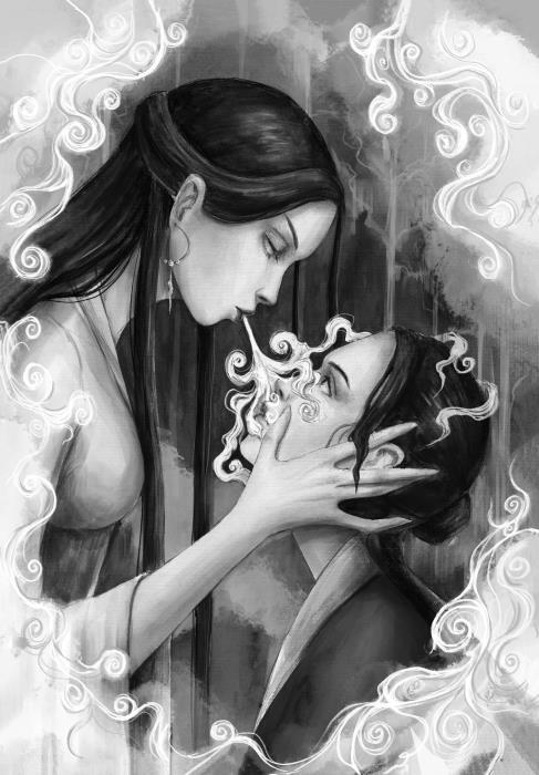 Он проснулся оттого, что на лицо ему посыпался снег. Дверь хижины была открыта, и в снежном сиянии (юки-акари) он увидел женщину… женщину в белом. Склонившись над Мосаку, она дула на него, и ее дыхание висело в воздухе, как белый дым. Потом она повернулась к Минокити. Тот понял, что не может даже вскрикнуть. Белая женщина нагибалась все ниже; их лица уже почти соприкасались. Минокити увидел, что она очень красива, хотя ее взгляд внушал ему ужас. Некоторое время она смотрела на юношу, а затем улыбнулась и прошептала: