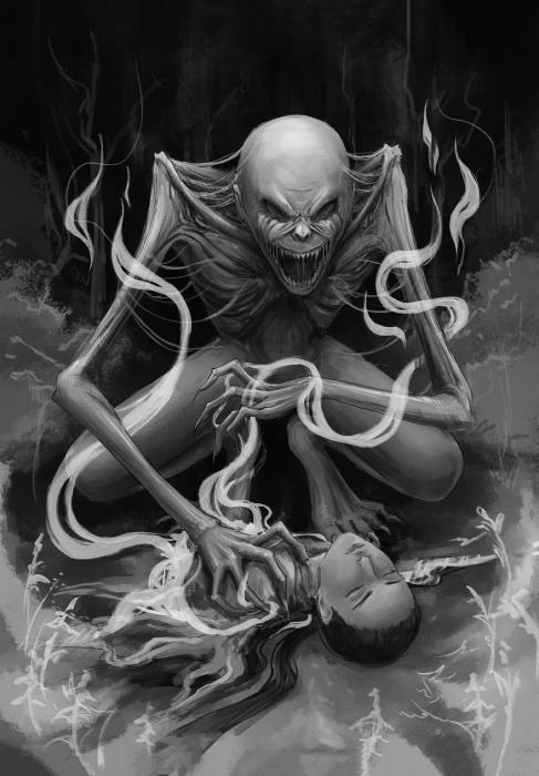 Глухой ночью в дом бесшумно проникло огромное, едва видимое в потемках существо. Увидев его, Мусо словно окаменел. Чудовище схватило покойника и сожрало быстрей, чем кошка мышь. Начав с головы, оно съело все, даже волосы, кости и погребальный саван. Затем ужасная тварь проглотила жертвенные приношения. После этого она исчезла так же таинственно, как появилась.