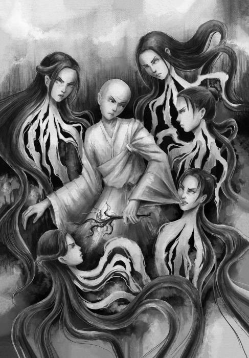 – Если мое тело спрятали, я не смогу с ним соединиться! А значит, я умру! И все из-за какого-то монаха! Ну я до него доберусь! Я его растерзаю! Сожру! Вон он, за деревом! Он прячется за деревом! Жирный трус!