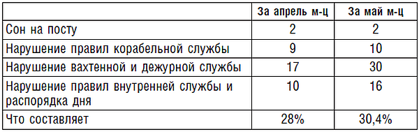Большое число дисциплинарных взысканий за плохое отношение к службе и нарушения организации службы показывает большие недочеты в этом вопросе. За 1-й квартал 1943 года наложено дисциплинарных взысканий всего – 440. Из них: за неисполнение приказаний – 4; сон на посту – 18; нарушение правил корабельной службы – 41; нарушение вахт, дежурн. службы – 45; небрежное обращение с оружием – 5, что составляет 25,3% всех проступков падает на нарушения в организации службы.