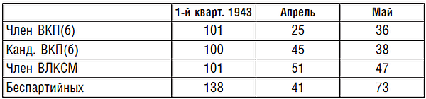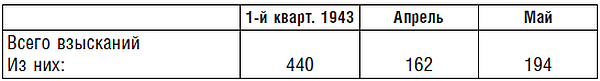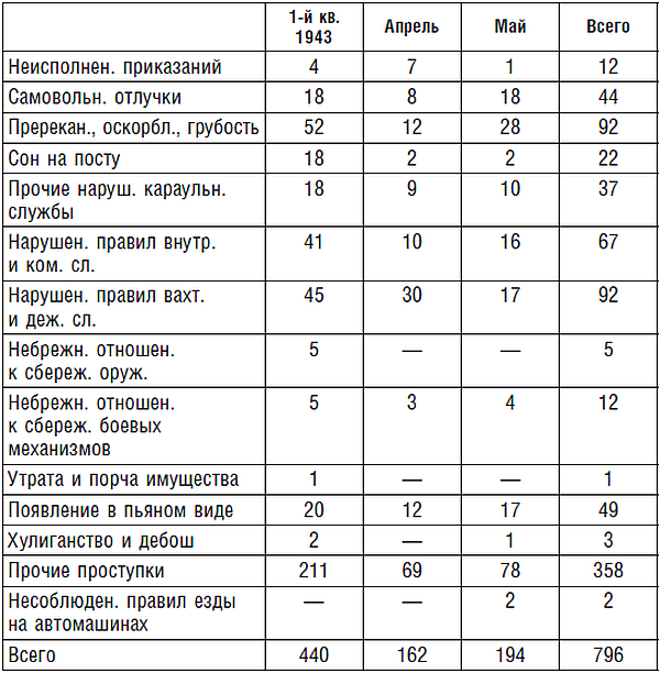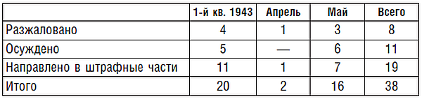 Всего за 1943 г. разжаловано, осуждено и отправлено в штрафные части за систематическое нарушение дисциплины, преступно-халатное отношение к служебным обязанностям, самовольные отлучки: