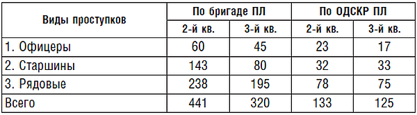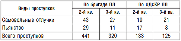 Состояние воинской дисциплины характеризуется некоторым снижением количества проступков в 3-м квартале по сравнению со вторым кварталом 1944 года. По характеру проступков и абсолютным цифрам говорят о том, что состояние воинской дисциплины на БПЛ не отстает от требований приказов товарища Сталина, вытекающих из обстановки на фронтах и в стране.